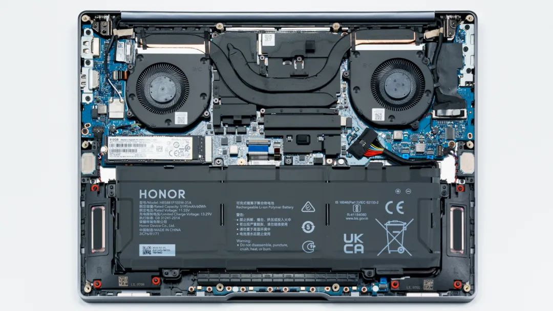 上图是荣耀 MagicBook V 14 2022的拆机实拍图,双热管双风扇的组合。