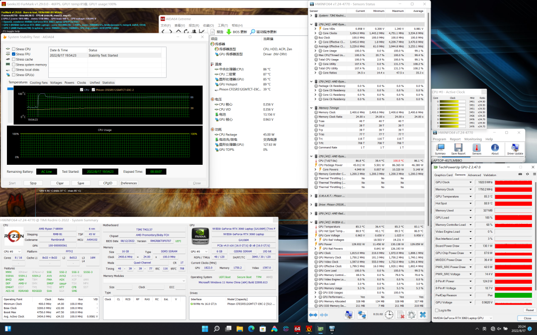 显卡功耗约130W,温度85.3℃,频率1822MHz。