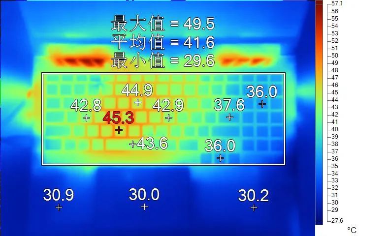 表面温度如上图所示,键盘键帽最高45.3℃出现在键盘中部,WASD键附近约为42.8℃,方向键36℃。左腕托温度为30.9℃。