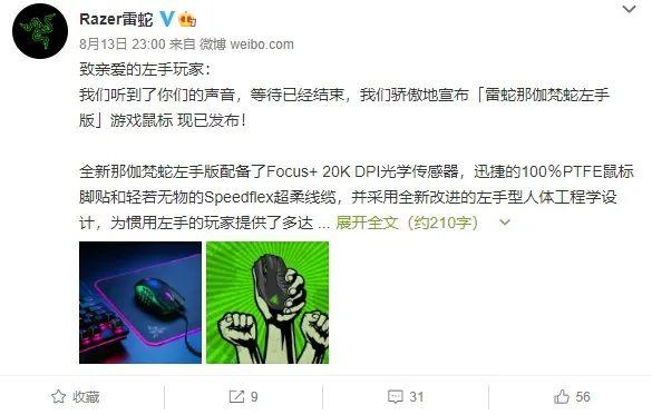 雷蛇官方 13 日正式宣布将推出那伽梵蛇 2020 左手版。该鼠标建议零售价 699 元,近期将于雷蛇天猫旗舰店独家发售。