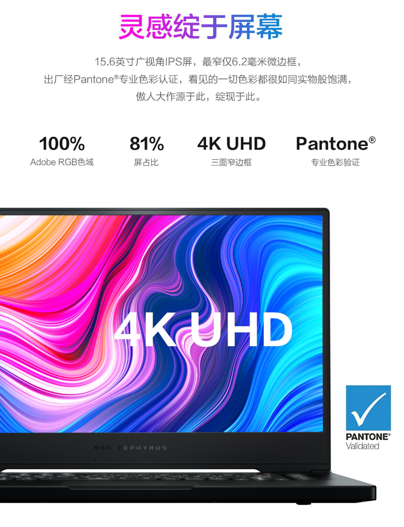 屏幕方面,作为一款针对创意设计领域的产品,ROG 幻15搭载了一块15.6英寸的屏幕,分辨率为4K,官宣色域100% Adobe RGB,并通过了PANTONE专业色彩验证。
