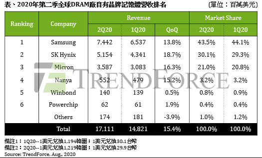 就目前而言,参考最近Q2季度的出货量报告,目前全球的DRAM芯片市场被三大巨头所统治。分别是占了43.5%的三星、30.1%的SK海力士和21%的美光。这三家一起就占据了近乎95%的市场。