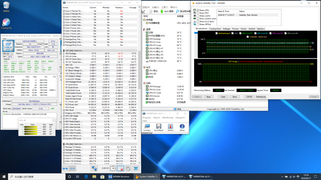 在满载状态下,CPU温度最高91℃,稳定在77℃,功耗12.3W,频率维持在2.7GHz。