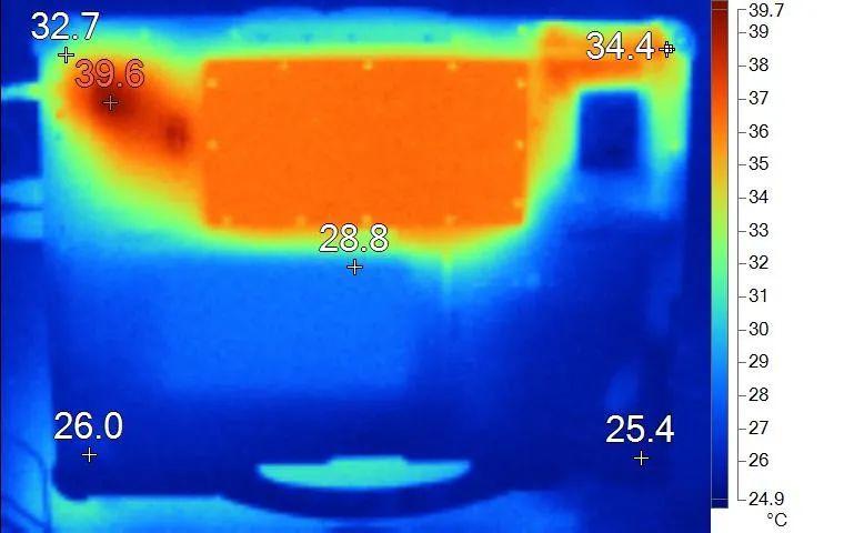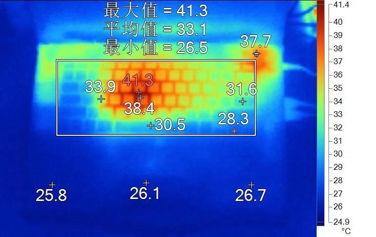 表面温度如上图所示,键盘键帽最高温度出现在键盘中部,键帽最高温度38.4℃,WASD键附近为33.9℃左右,方向键28.3℃,背面中心点28.8℃。
