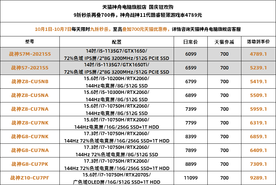 不仅是神舟 战神S7系列,战神全系列都有促销活动,这边有一张表格,供大家参考价格:
