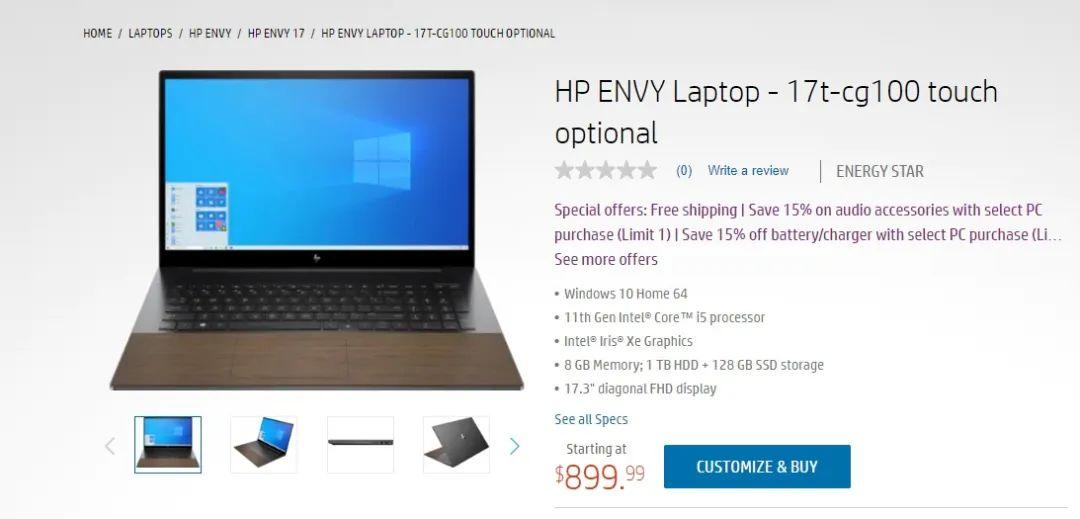 惠普美国官网现已上架了 ENVY 17 笔记本,搭载 11 代酷睿处理器,配备了木制掌托。