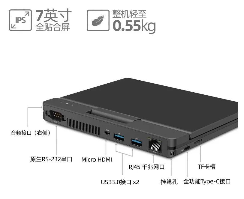 这次的新品壹号工程师 PC 为 7 英寸机身,重量约 550g,还拥有丰富的接口:配备有一个原生 RS-232 串口、一个 RJ45 千兆网口。这两个接口是网络运维工程师在日常测试维护中需要用到的。另外新品壹号工程师 PC机身上还配备有一个全功能 Type-C、两个 USB 3.0 等接口。