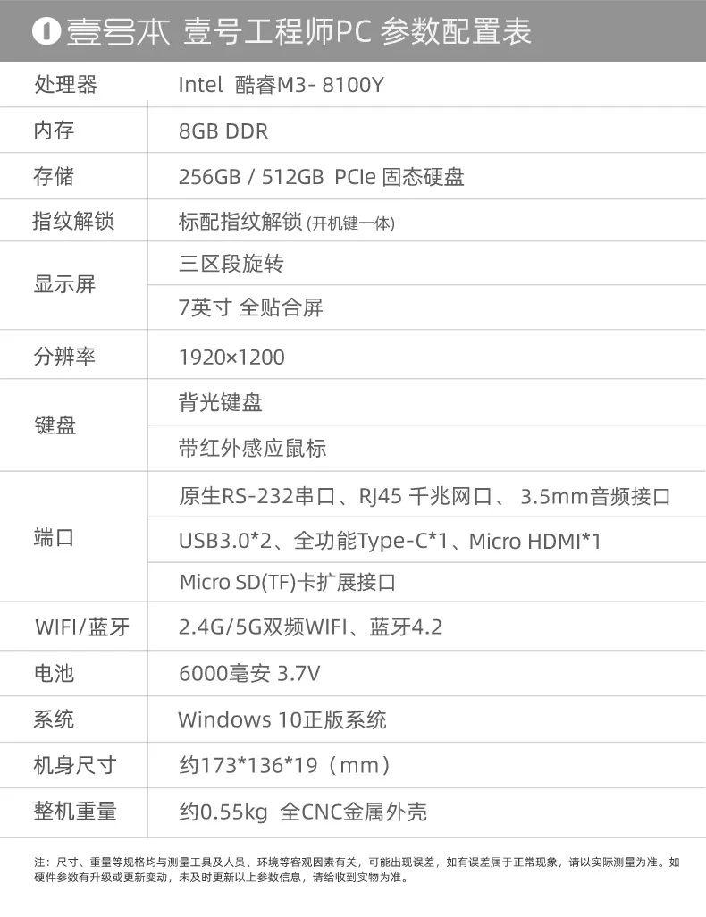 核心配置上,壹号工程师 PC 采用的是酷睿 M3-8100Y 处理器,睿频可达 3.4GHz,8GB 内存,硬盘为 M.2 2242 PCIe 固态硬盘。可选配 256GB/512GB,用户也可以根据需求后期自行升级更大容量的固态硬盘。