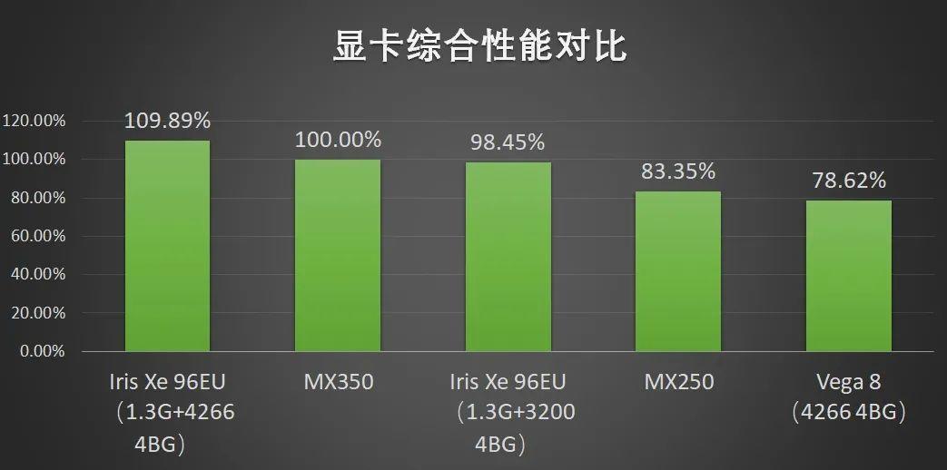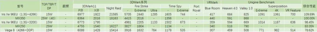 需要注意的几点是,首先这部分测试主要是跑分,实际应用会根据软件优化情况产生变化,例如96EU的核显跑分超过了MX350,但实际玩游戏时就不一定了。