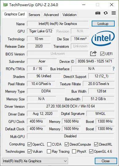 除了CPU外,Tiger Lake-U的核显也做了更新。i7-1165G7的核显拥有96EU(执行单元)的Iris Xe,频率1300MHz。