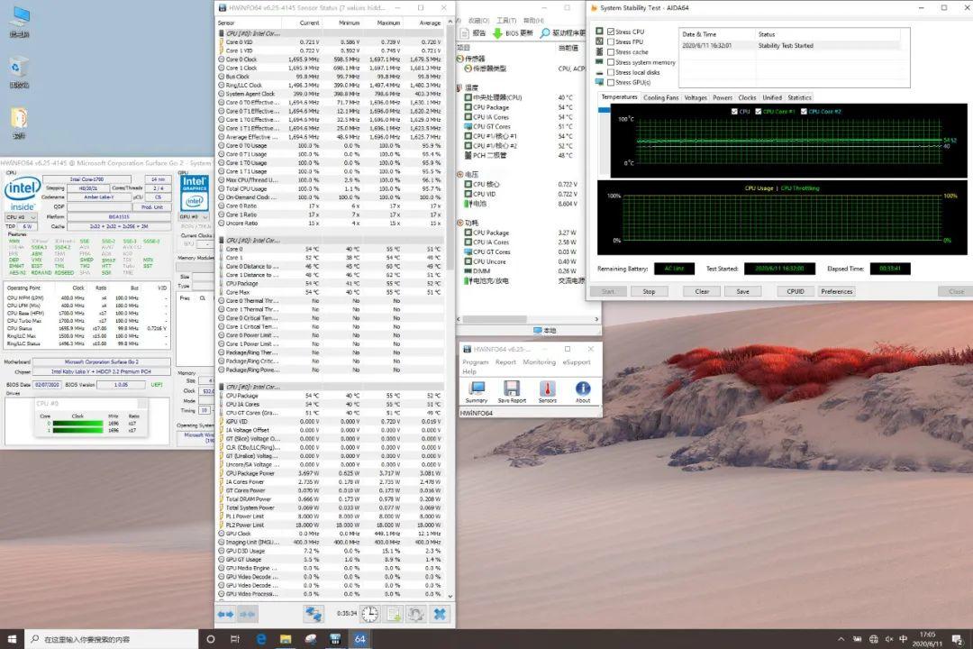 在满载状态下,CPU温度最高54℃,功耗3.7W,频率维持在1.7GHz。