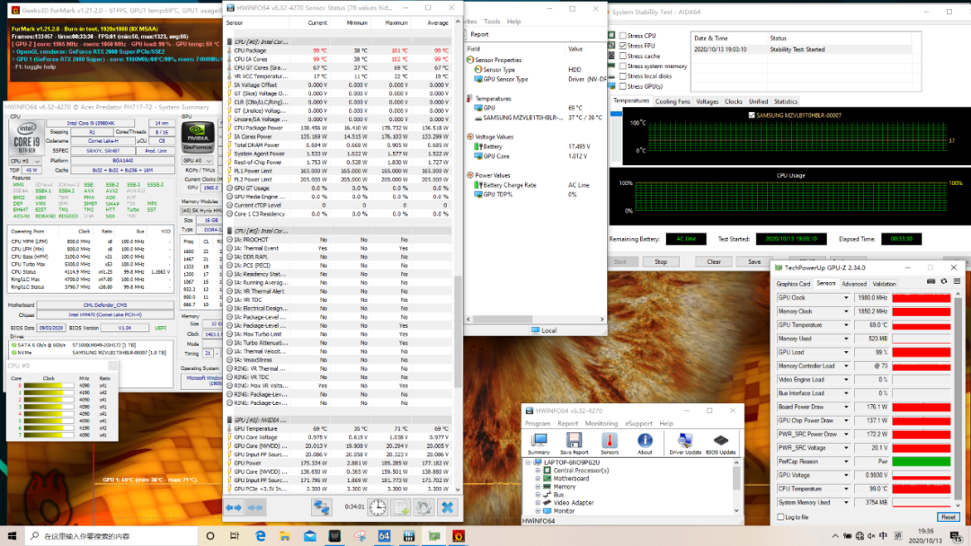 总的来说,宏碁 战斧700 2020的散热表现不错,上一代的战斧700双烤只能做到75W+180W,这一代能做到135W+180W,没有愧对自己庞大的体型。