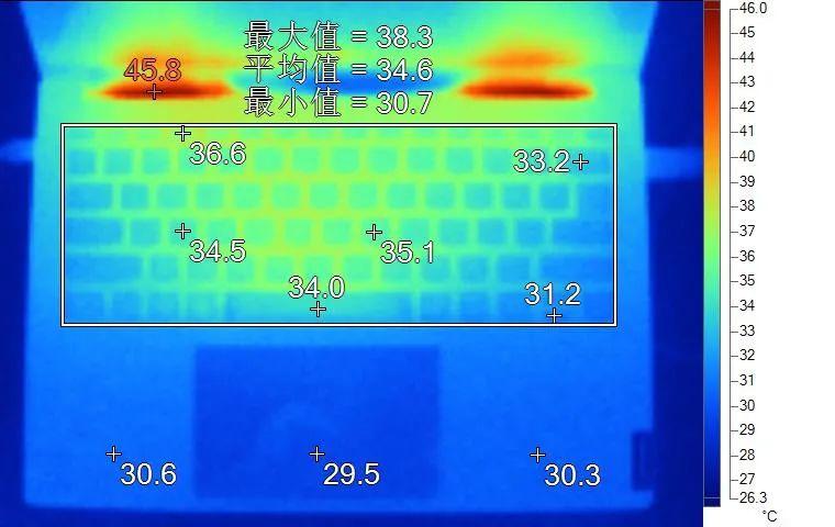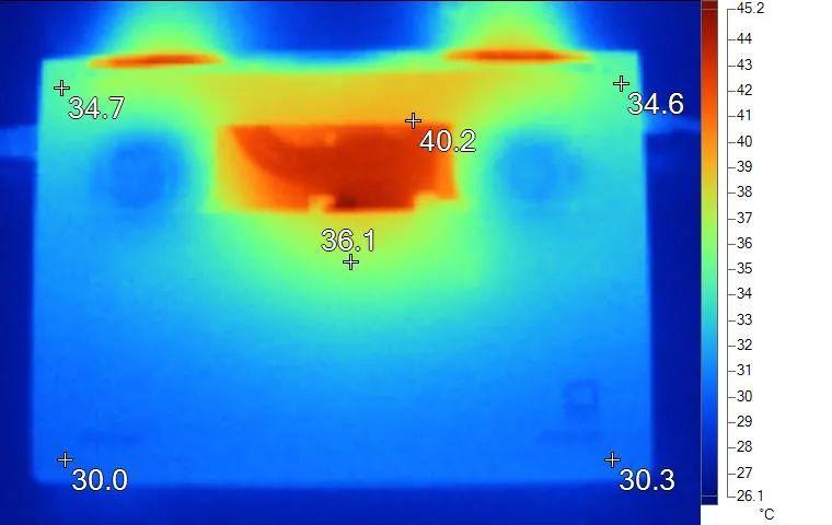 表面温度如上图所示,键盘键帽最高为36.6℃,WASD键位区域在34℃附近。背面温度最高约40.2℃,中心点温度36.1℃。
