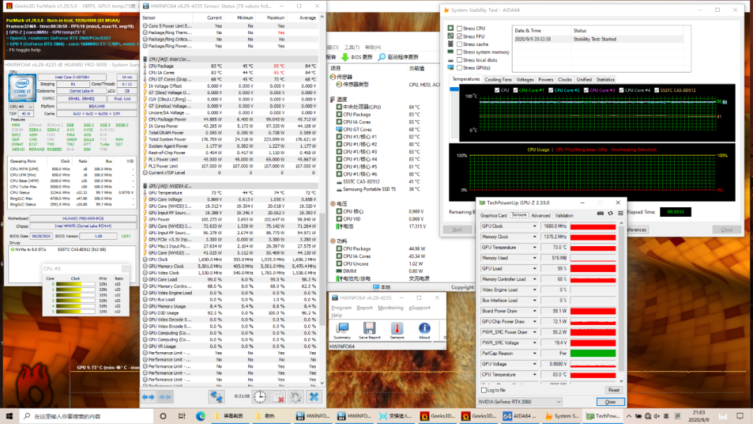 狂战模式下满载,CPU温度最高95℃,稳定在83℃,功耗45W,频率维持在3.2GHz。显卡温度73℃,功耗100W,频率1680MHz。