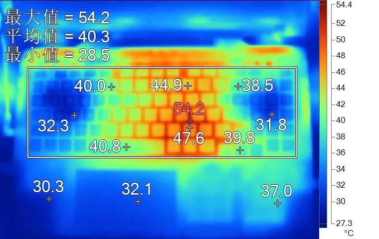 表面温度如上图所示,键盘键帽最高温度出现在机器中间部分,键帽最高温度为47.6℃,WASD键32.3℃,方向键39.8℃。除了最高温度较高以外,整体高温区域不算大,日常使用的WASD键也比较凉快。