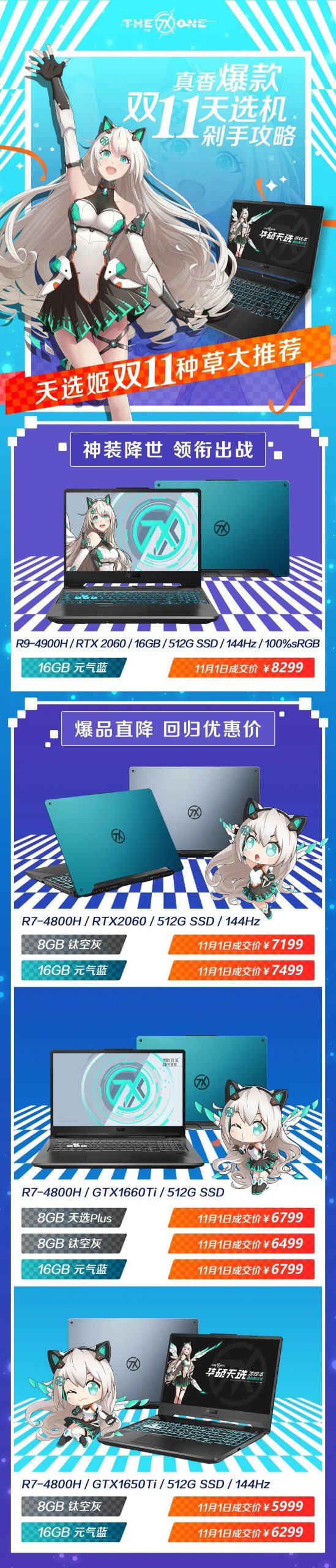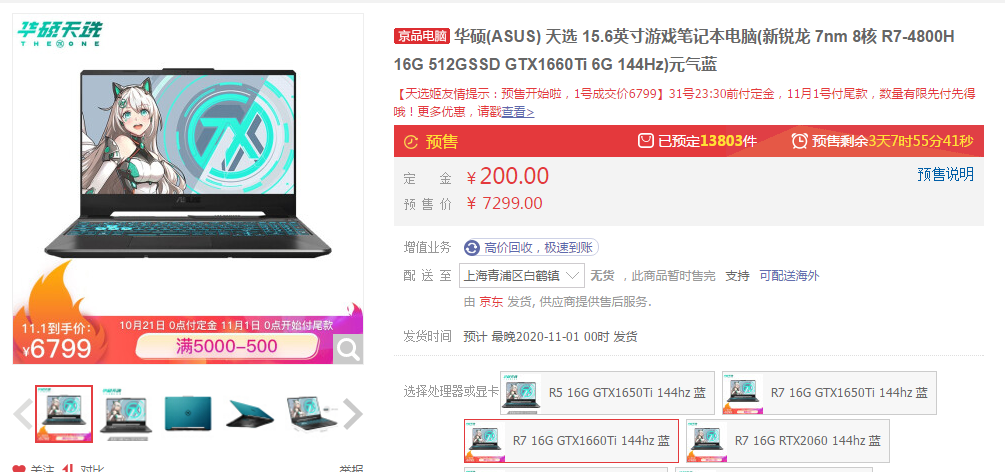 而同时低配版的天选同样也大量到货, R7 4800H+16GB内存+512GB固态,搭载GTX1660Ti 6G显卡+144Hz电竞屏的型号,11月1日成交价6799元。