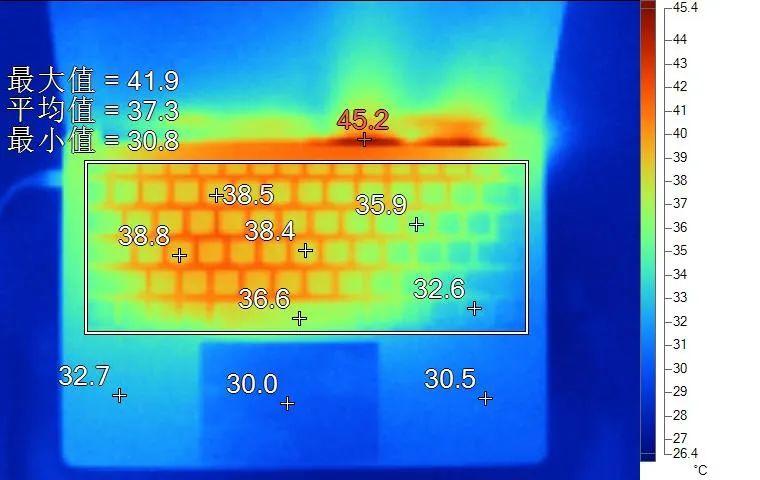 表面温度如上图所示,键盘键帽温度最高为38.8℃,WASD键位区域在38.8℃附近,方向键32.6℃。