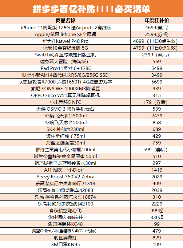 上图是本次百亿补贴11.11清单,除了拯救者R7000这类热门游戏本,买iPhone11送Airpods 2、Switch动森限定主机等数码产品都有促销,连我老婆每天都用的资生堂红腰子居然也在列
