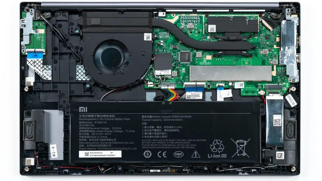 上图是红米 RedmiBook16 锐龙版的拆机实拍图,单热管单风扇的组合。