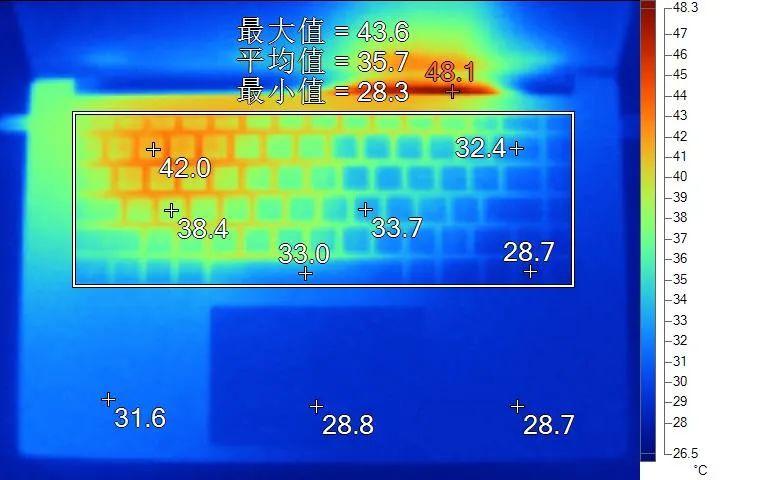 表面温度如上图所示,键盘键帽温度最高为42℃,WASD键位区域在38℃附近,方向键28.7℃。左腕托温度为31.6℃。