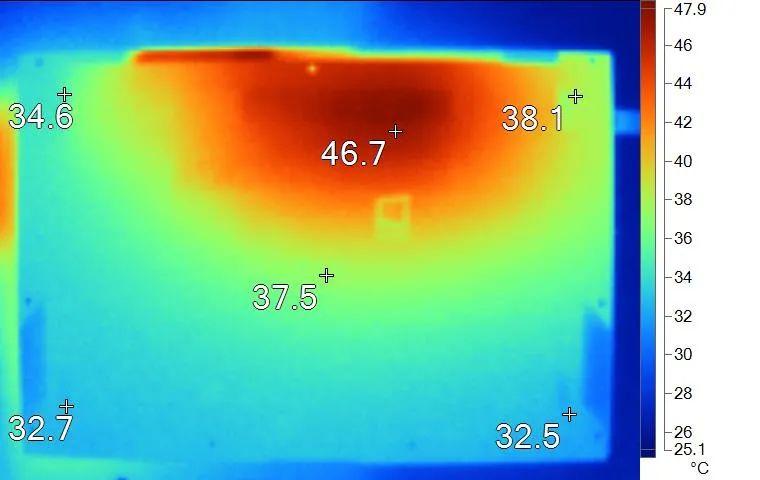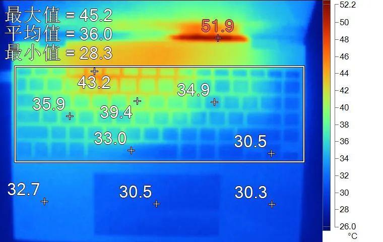 表面温度如上图所示,键盘键帽温度最高为43.2℃,WASD键位区域在36℃附近,方向键30.5℃,背面最高46.7℃。