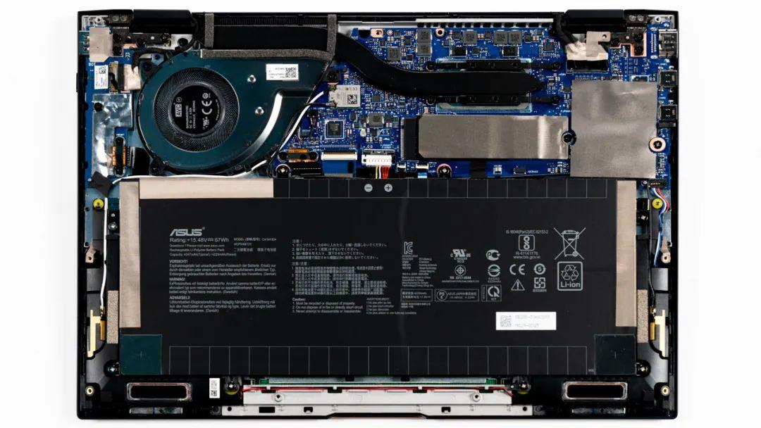 上图是华硕 灵耀X 逍遥的拆机实拍图,67Wh的电池占据了大半内部空间,散热模组是单热管单风扇的组合,风扇的扇叶比较密集。