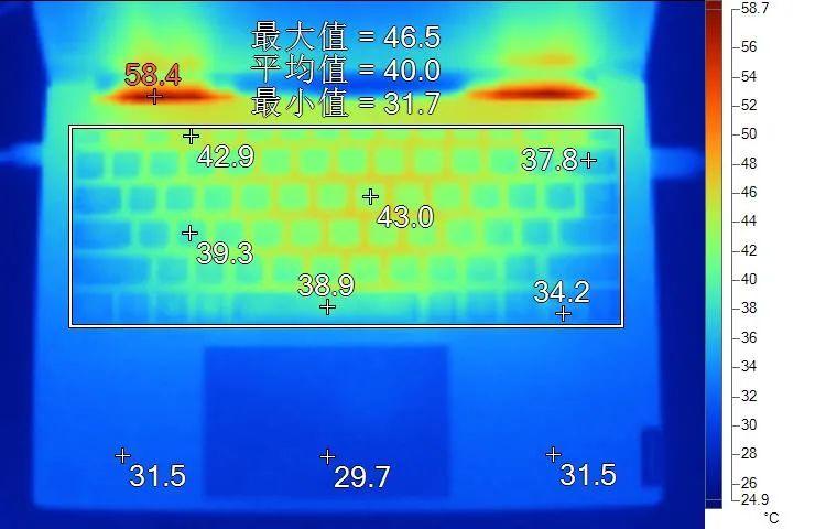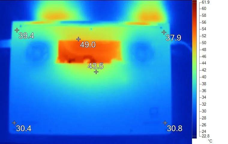 表面温度如上图所示,键盘键帽温度最高为43℃,WASD键位区域在39℃附近,方向键34.2℃。背面最高温度约49℃。