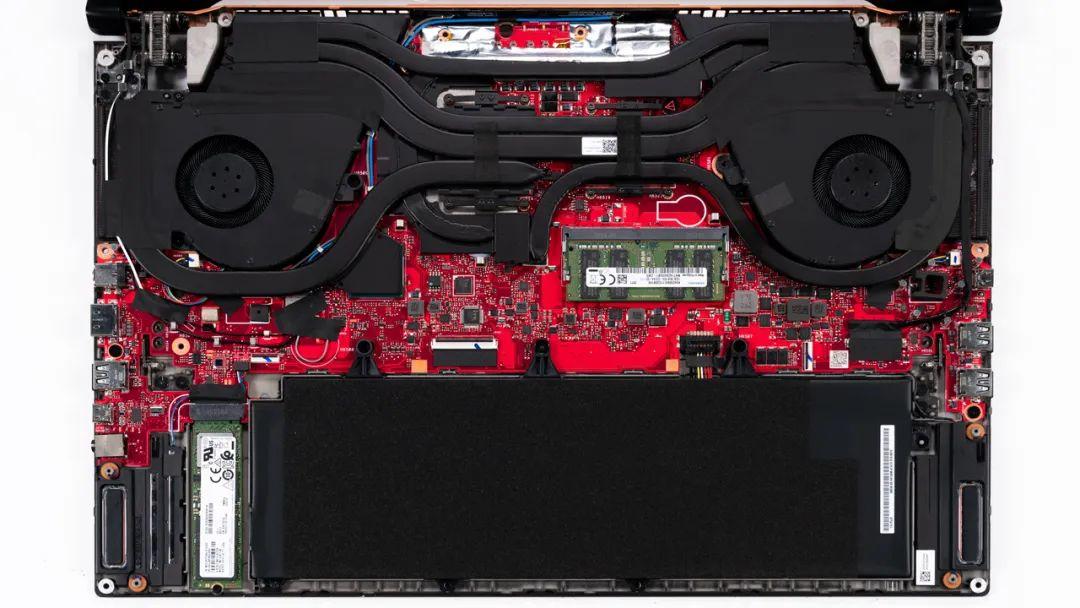 上图是ROG 冰刃4 Plus的拆机实拍图,6热管双风扇的组合,其中两根热管用于供电和显存等部分的散热。