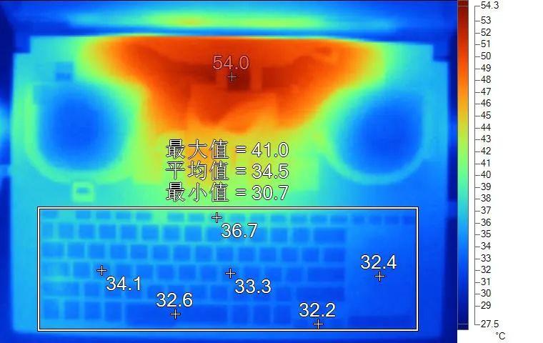 表面温度如上图所示,键盘键帽温度最高为36.7℃,WASD键位区域在34℃附近,方向键32.2℃。触摸板温度为32.4℃。