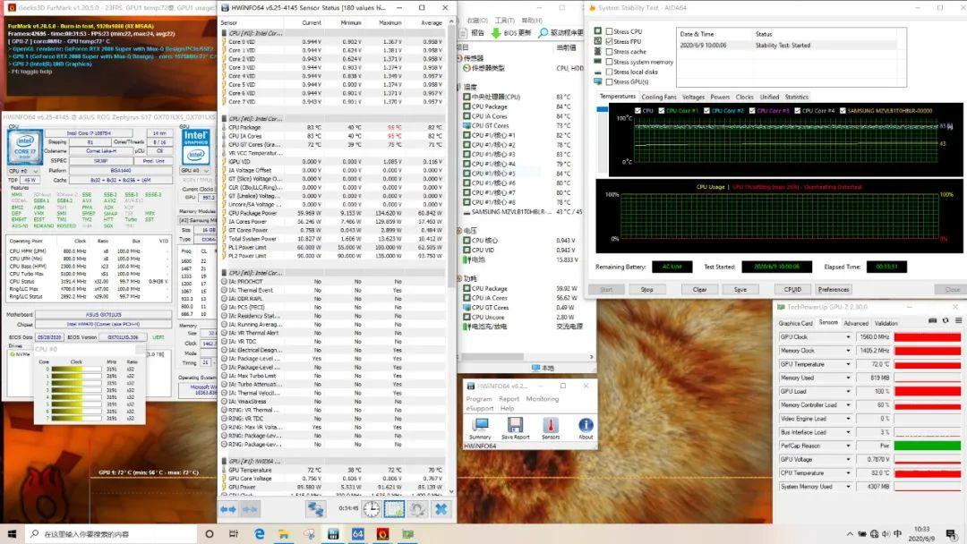 得益于使用液金,这台电脑也用上了8核心的i7-10875H,且双烤时功耗能维持60W,实际上应该还能进一步提高,只是核心温度势必会明显上升。