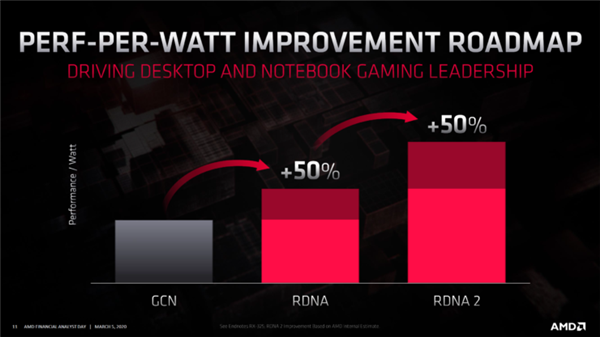 而从目前已知的各项数据显示,从GCN到第一代的RDNA架构开始,每一代都实现了每瓦性能增加50%。