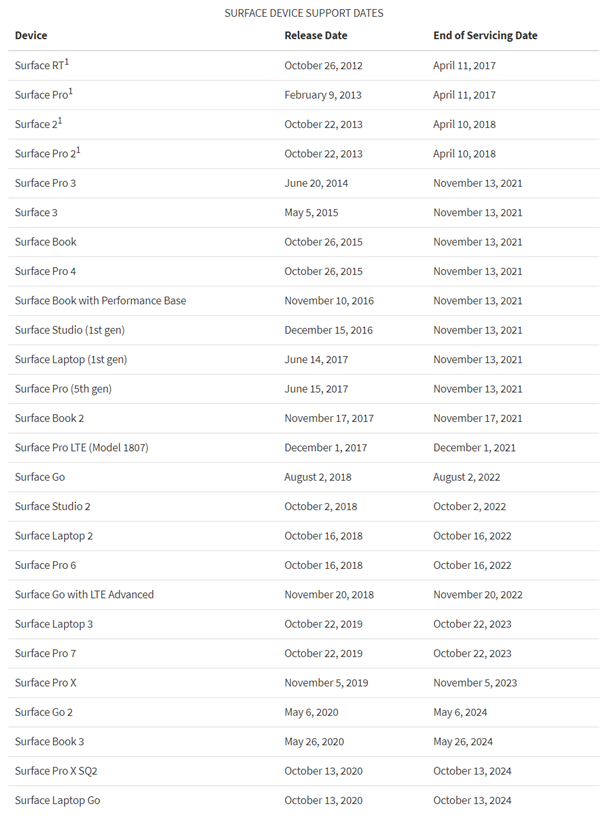 在这份列表中,较早的Surface设备获得5年更新支持,比如Surface RT、Surface Pro和Surface 2,较新的Surface设备通常从发布之日起获得4年更新支持。