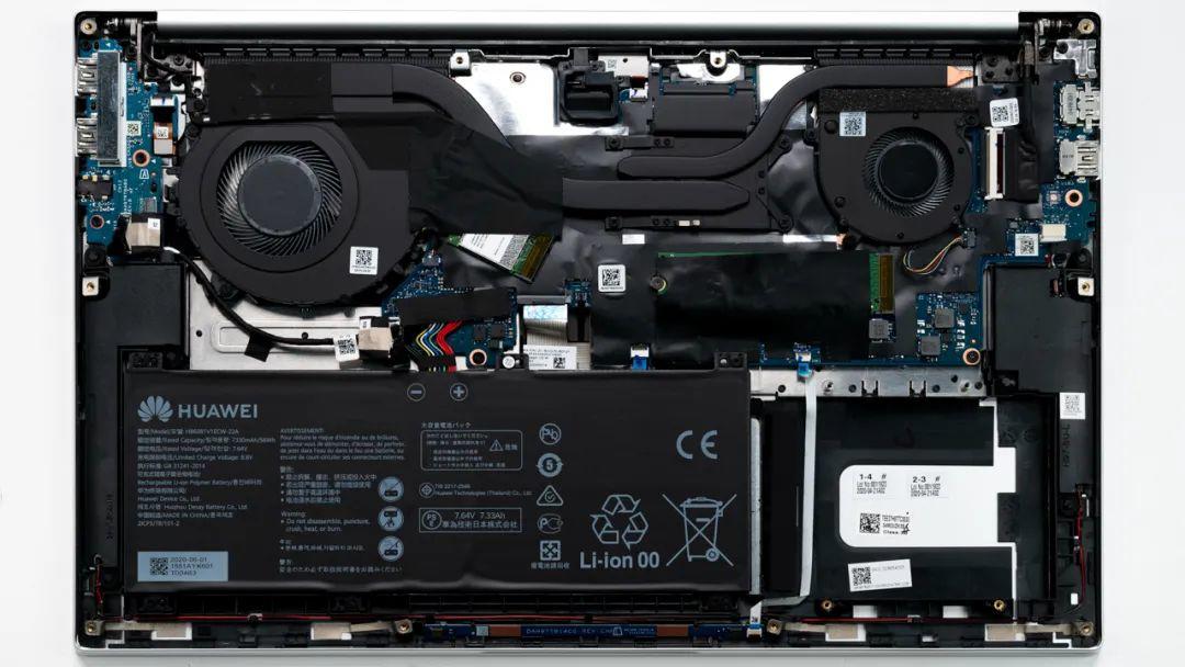 上图是荣耀 MagicBook Pro 2020 锐龙版的拆机实拍图,双热管双风扇的组合,和Intel酷睿版一致。