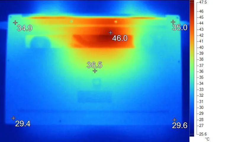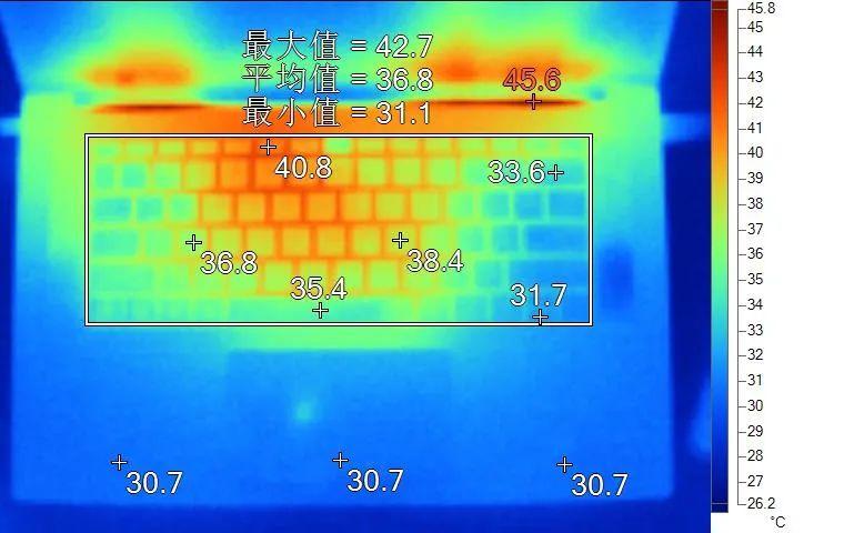 表面温度如上图所示,键盘键帽温度最高为40.8℃,WASD键位区域在37℃附近,方向键31.7℃。背面最高温度约46℃。