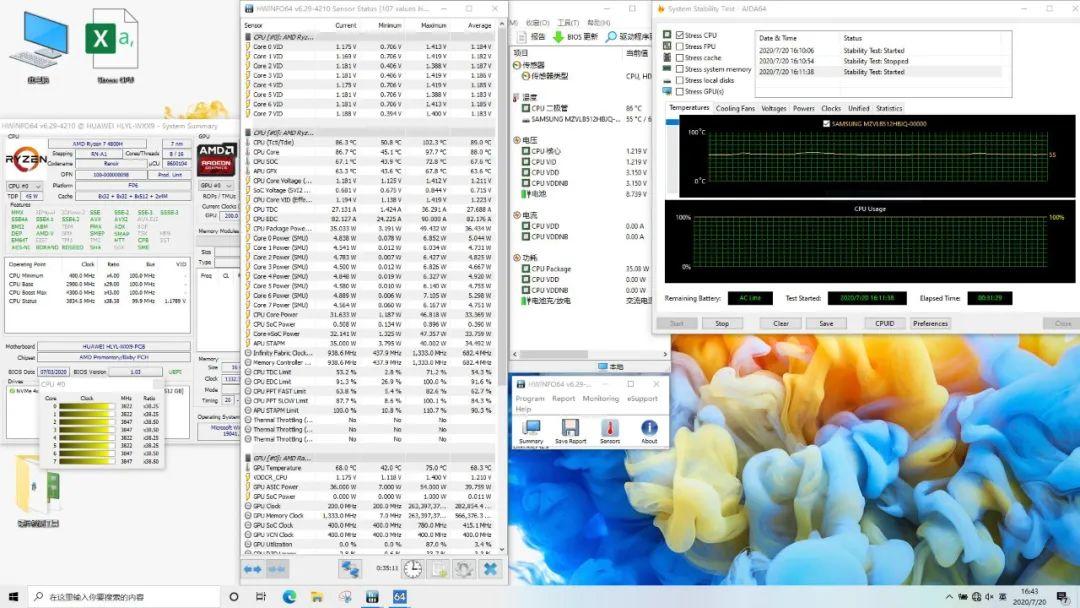但有趣的是,在单烤运行FPU时,R7 4800H可以长时间稳定地以40W功耗运行,此时核心温度在84.4℃,由于Stress FPU主要运行浮点运算,CPU频率降低到3.05GHz。