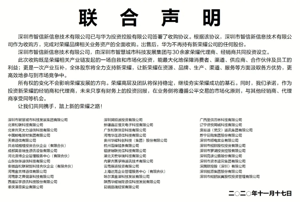 不知道有多少人看过这篇联合声明,荣耀即将彻底被华为卖掉,从今往后,华为和荣耀就彻底是两个独立的品牌了: