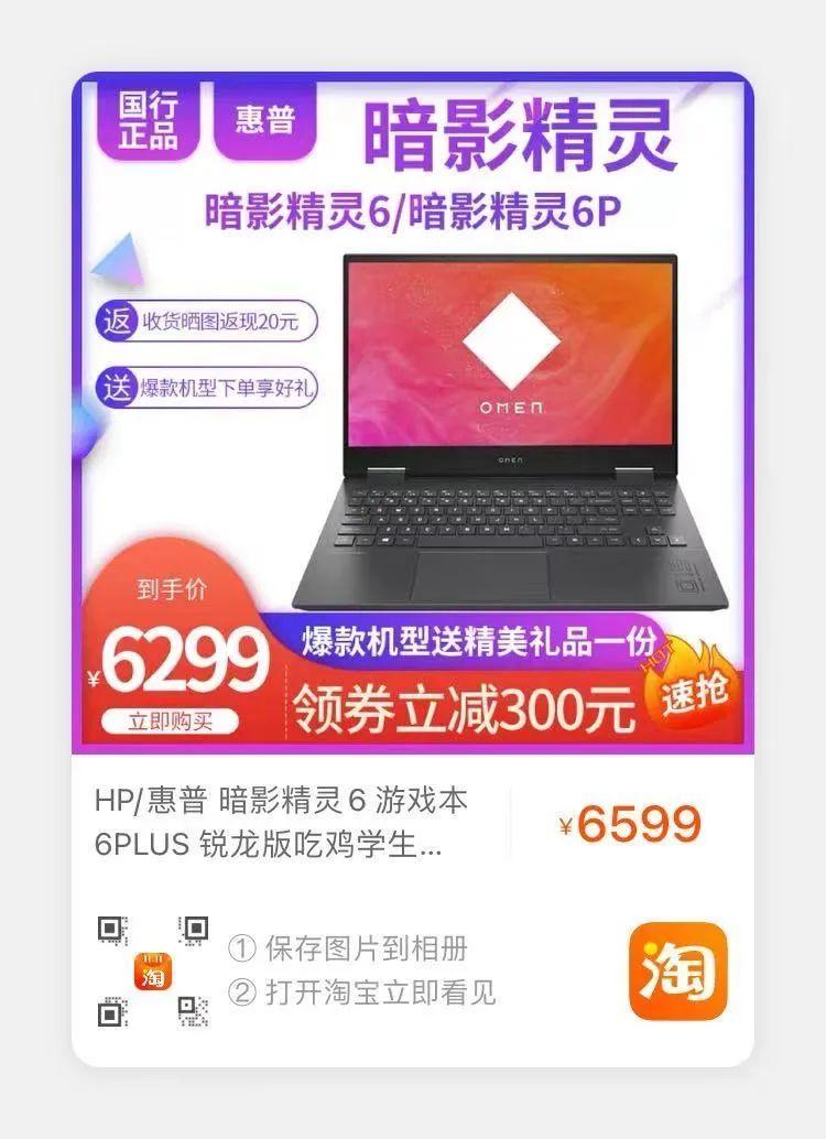 在淘宝店铺【猪王笔记本】里,暗影精灵6售价6299元起。(当然是低配版)