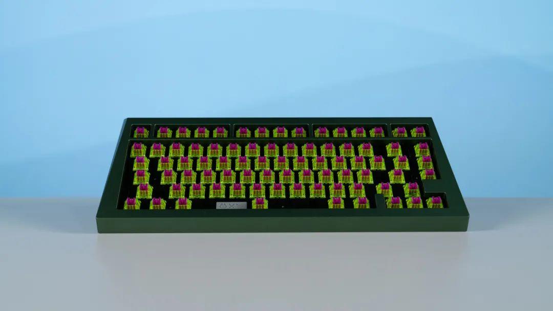 打开箱子映入眼帘的就是套件本体了,我们这款由于是白嫖来的,已经预装了轴体在上面,紫绿紫绿的配色差点让我想起初号机。