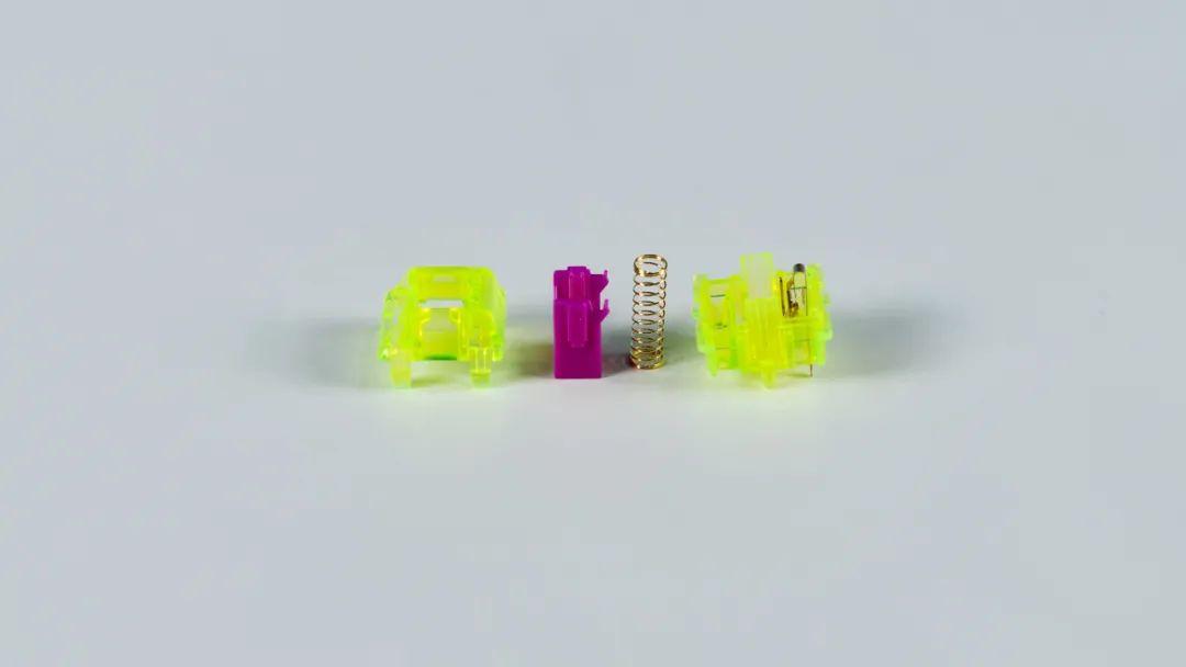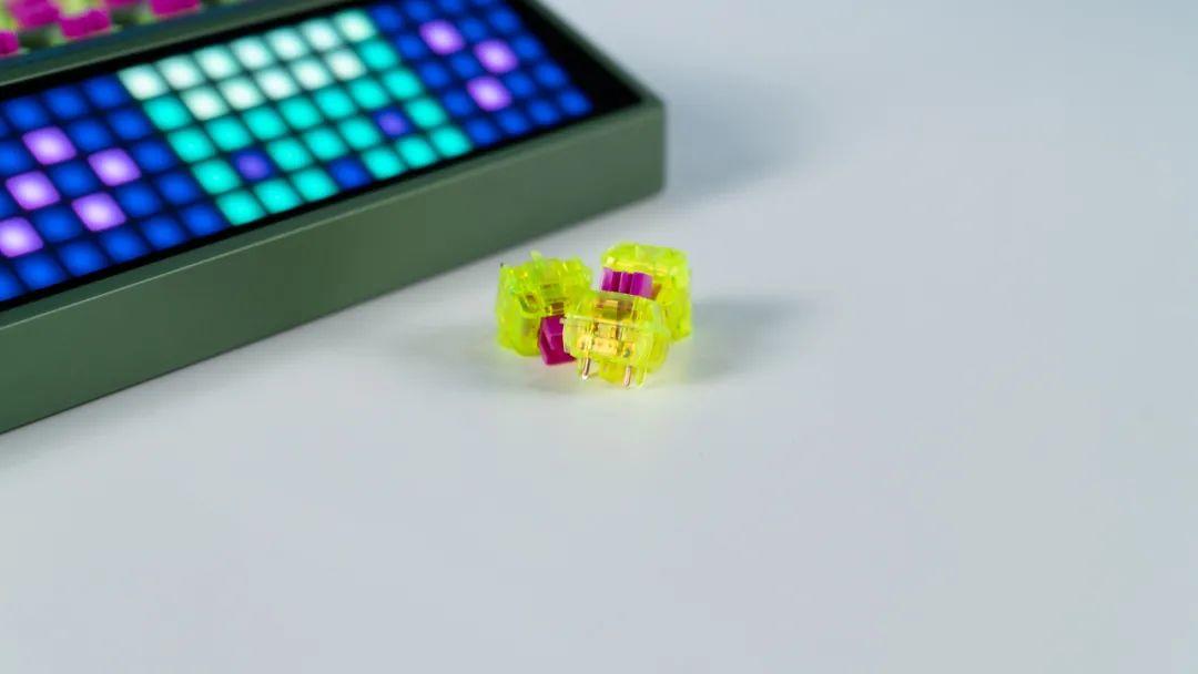轴体的外壳采用透明黄色,轴心采用紫色设计,“风骚”程度拉满,而它拥有段落感,类似于大家熟知的Cherry茶轴,但在体感段落感和触发力度上,都要高于Cherry茶轴。好在CyberBoard采用热插拔技术,可以随时更换你喜欢的机械轴体。