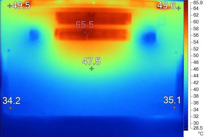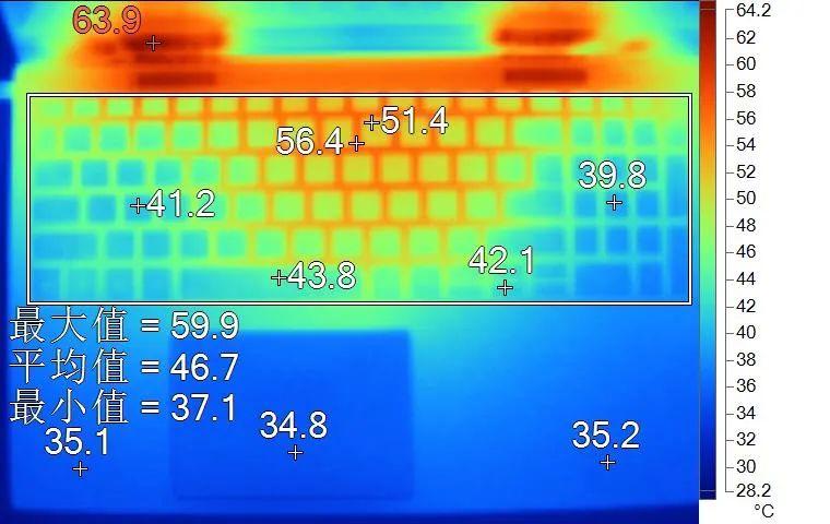 表面温度如上图所示,键盘键帽最高温度出现在键盘中部,为51.4℃,WASD键区41.2℃,方向键42.1℃。左腕托温度为35.1℃,背面中心点为47.5℃。