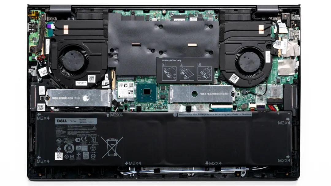 上图是戴尔 灵越7500的拆机实拍图,双风扇双热管的组合,转轴与鳍片+出风口放置在一起,导致散热能力受到了一些影响。