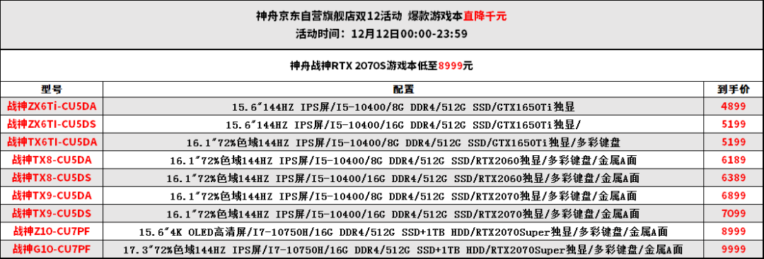 不仅是神舟 战神ZX6Ti-CU5DA,战神全系列都有促销活动,这边有一张表格,供大家参考价格: