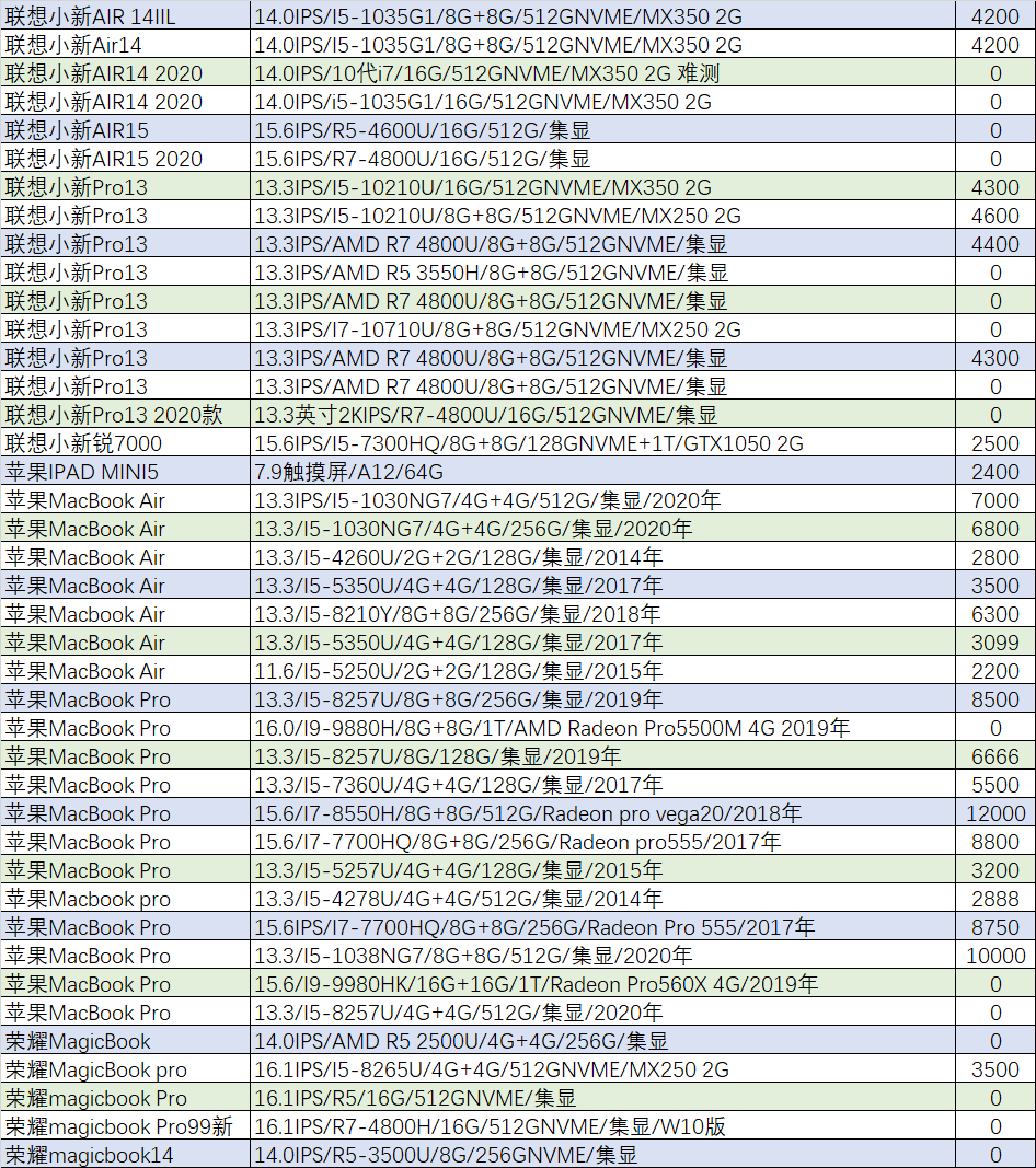 上周已售出机型:(无法列出成色,价格仅供参考)