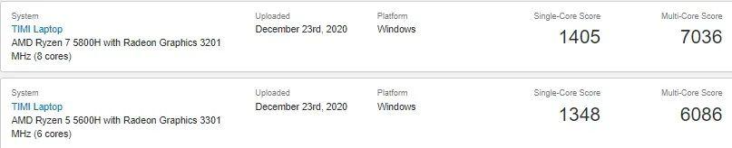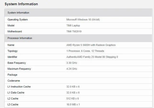 搭载 AMD 新款 Ryzen 5000H 系列处理器的 Timi 笔记本已经出现在了 Geekbench 网站上,应该是新款的游戏本。