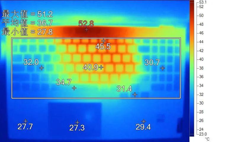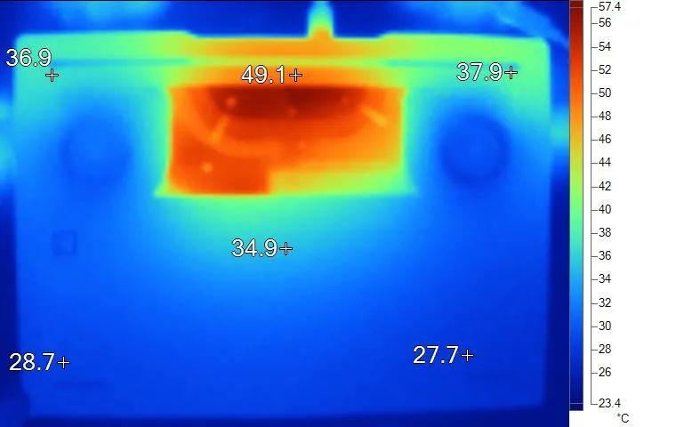 表面温度如上图所示,键盘键帽温度最高为45.5℃,WASD键位区域在32℃附近,方向键31.4℃。背面最高49.1℃,中心点34.9℃。