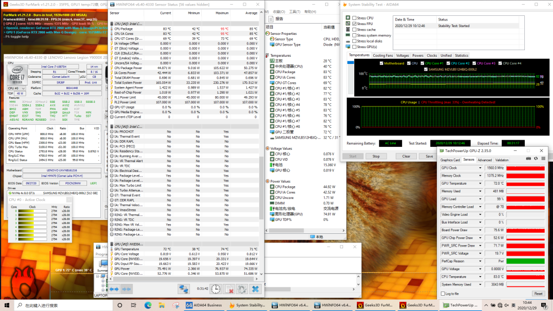 使用Fn+Q切换至“野兽模式”,采用Stress FPU+Furmark进行压力测试。