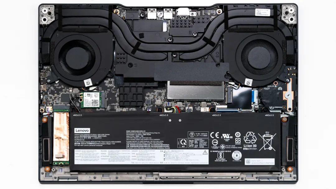 上图是联想 拯救者 Y9000X 2021的拆机实拍图,3热管双风扇的组合,整体结构和R9000X非常接近,上方少了一根均热用的小热管。