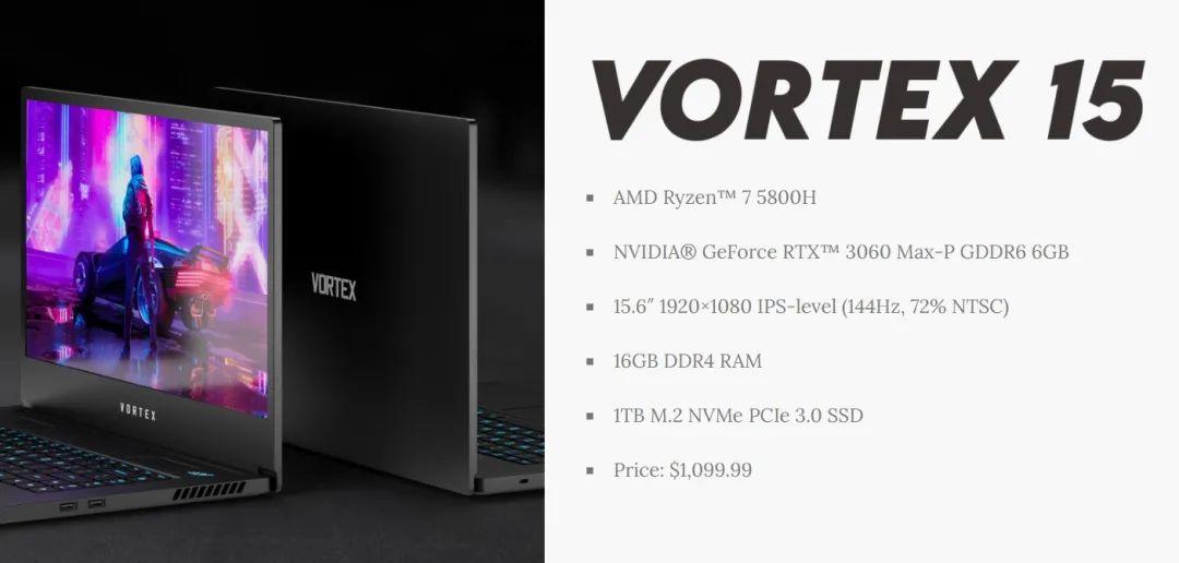 如上图所示, VORTEX 15 搭载了 AMD R7 5800H 处理器,显卡为英伟达 RTX 3060 Max-P 6GB,配备 16GB 内存和 1TB SSD,屏幕为 1080p 144Hz,售价为 1100 美元,约合人民币 7100 元。