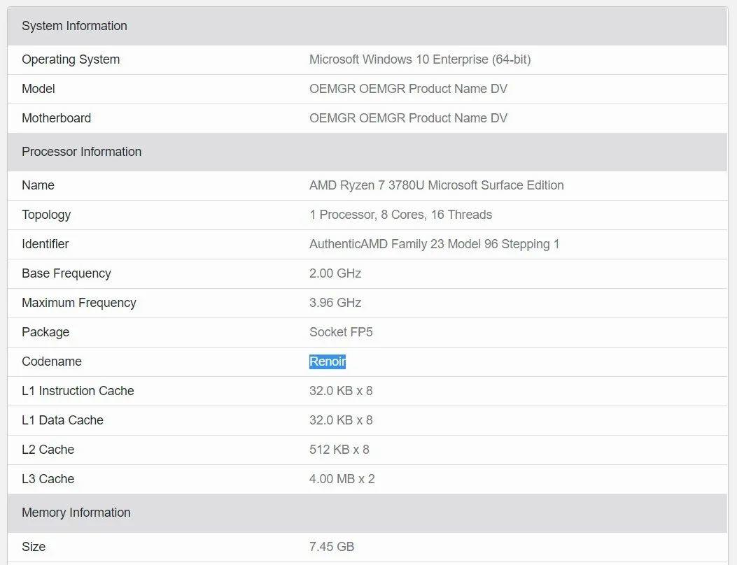 IT之家获悉,另一个基准测试表明,这家科技巨头正在测试一款未知的 Surface 产品,该产品采用了 AMD Renoir CPU,并且整体分数要高得多,这表明采用 Ryzen 4000 系列笔记本 CPU 的 Surface Laptop 即将面世。