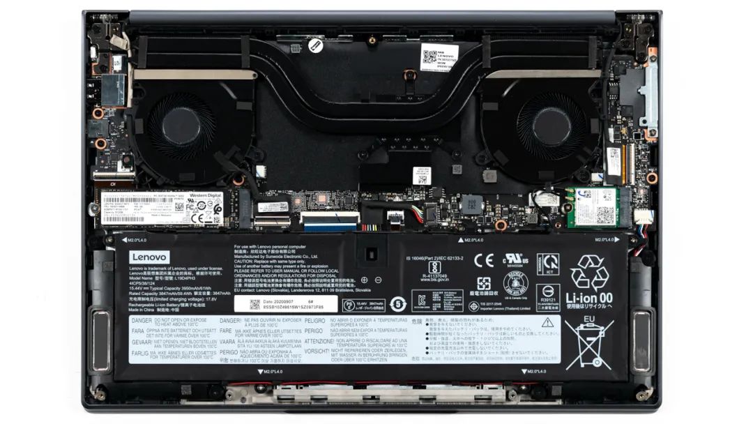 上图是YOGA 14s 2021款的拆机实拍图,双热管双风扇的组合,相比上一代产品增加了热管,风扇也更换了。